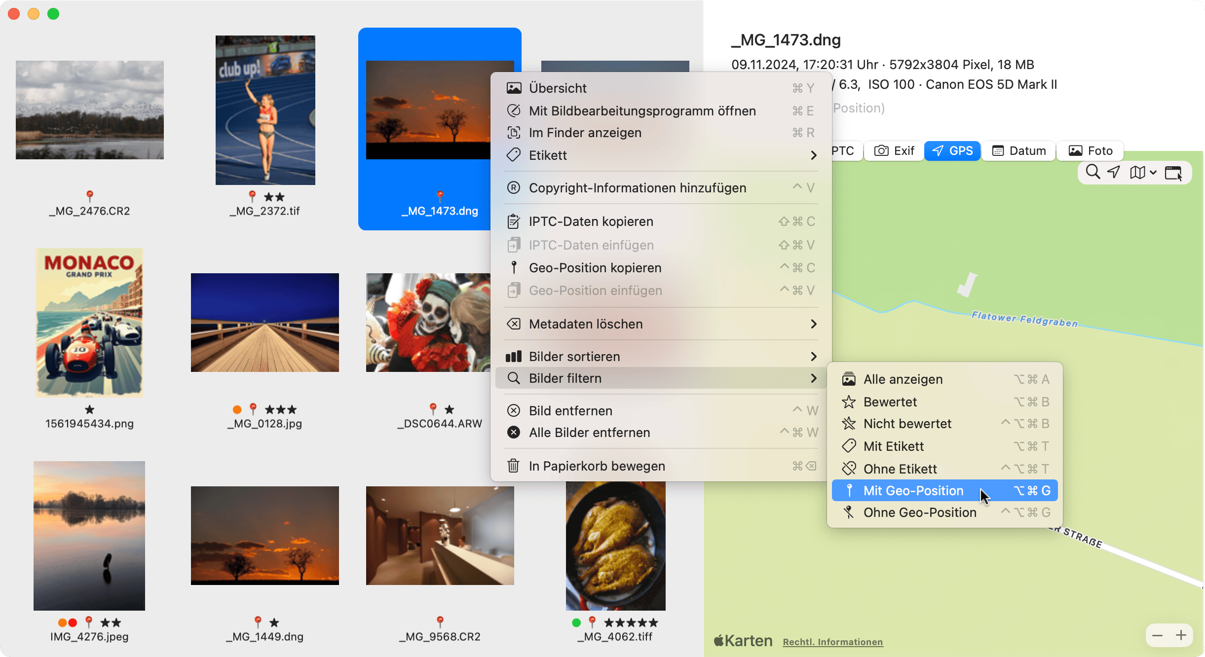 - Filtermöglichkeiten: Thumbnails lassen sich (siehe Screenshot) nach verschiedenen Kriterien filtern – zum Beispiel, um schnell alle Fotos ohne Geo-Position anzuzeigen und diese gezielt zu ergänzen.