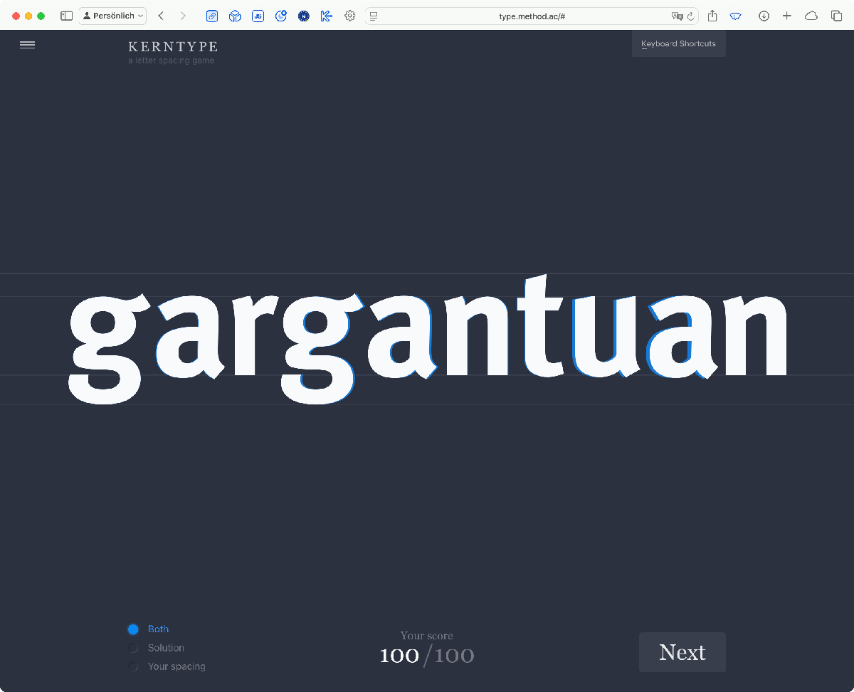 Netter Zeitvertreib für zwischendurch: Kerntype. Verschieben Sie die Buchstaben so, dass die Abstände untereinander optisch ausgeglichen sind. Im deutschen heißt dieser Vorgang Unterschneidung. Der Begriff kommt noch aus der Bleisatz-Zeit, als man Material an einem Kegel weggefeilt (= unterschnitten) hat, um den Abstand zur Nachbarletter zu verringern.