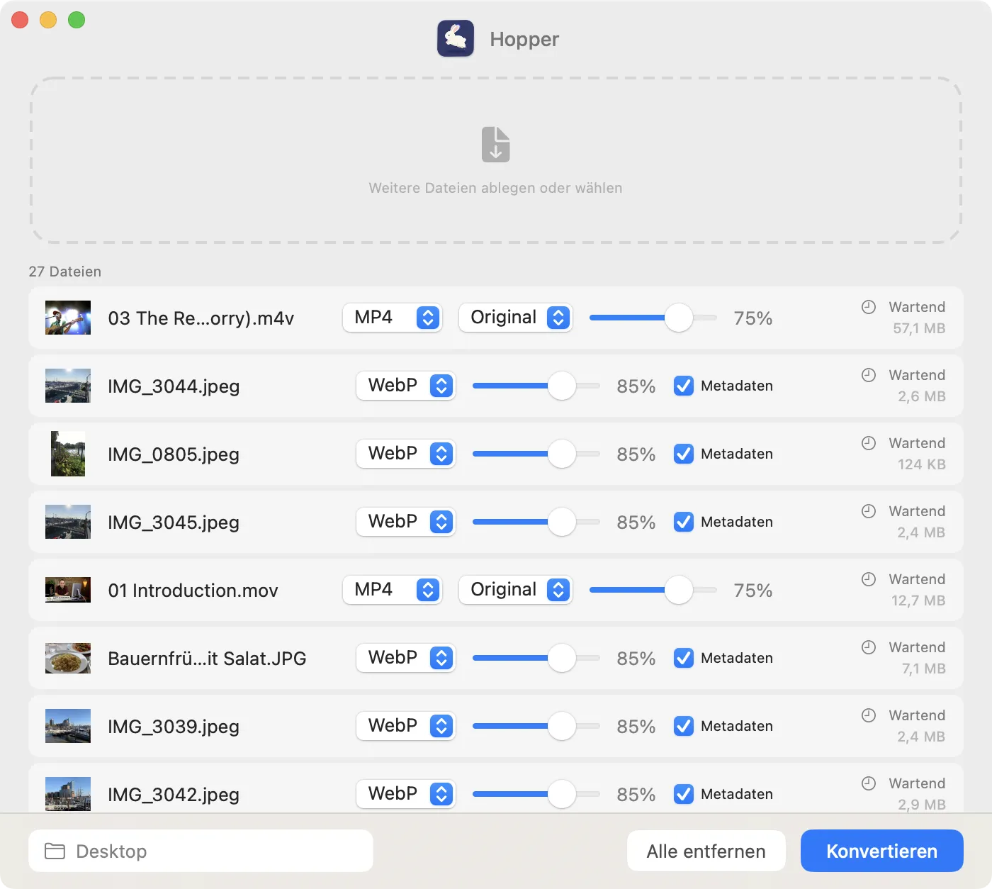 Dateien werden einfach ins Fenster gezogen – beliebig viele, auch gemischt aus verschiedenen Formaten. Alternativ lassen sich Dateien und Ordner direkt auf das App-Icon im Dock ziehen oder über das Dienste-Kontextmenü im Finder mit „In Hopper öffnen" übergeben.