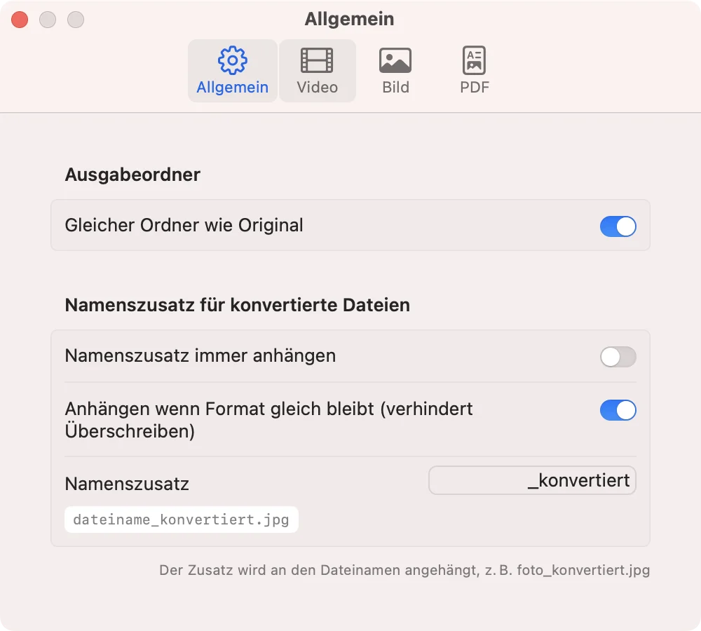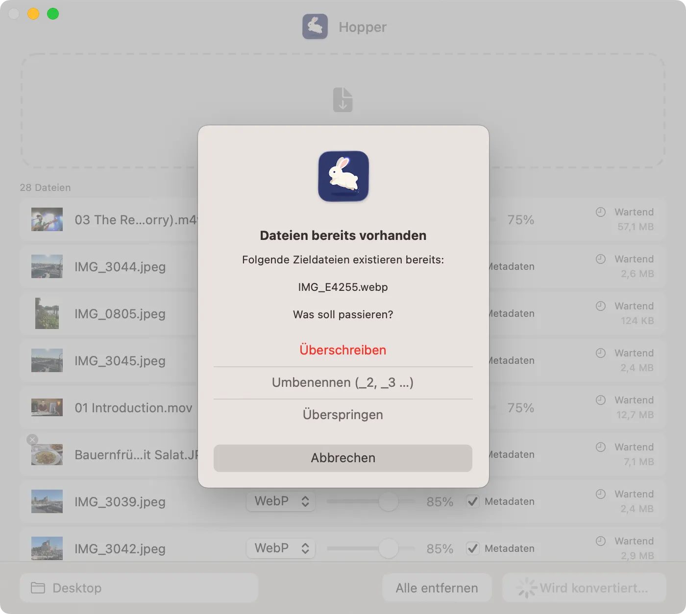 Existieren Zieldateien bereits, fragt Hopper vor dem Konvertieren nach – überschreiben, umbenennen, überspringen oder abbrechen. Der Speicherort ist frei wählbar, und an den Dateinamen lässt sich automatisch ein Zusatz anhängen, zum Beispiel _klein oder _web.