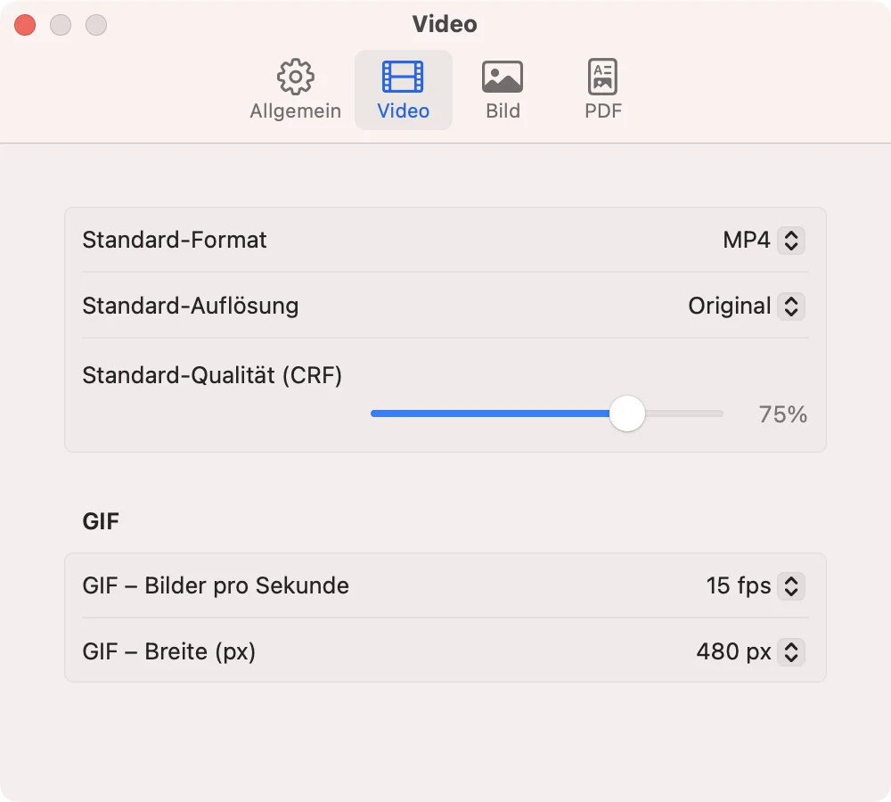 Videos lassen sich in MP4, MOV, MKV oder GIF umwandeln, wahlweise mit reduzierter Auflösung und einstellbarer Qualitätsstufe.
