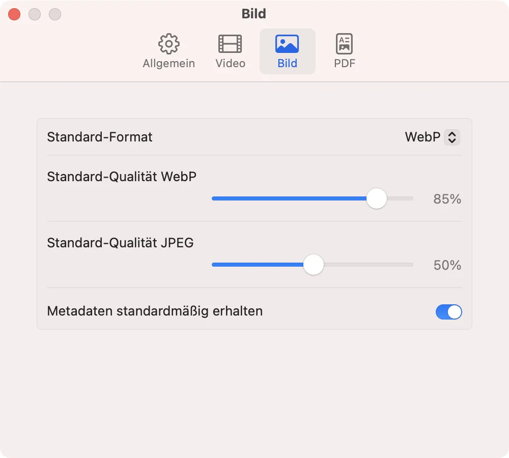 Bilder können als WebP oder JPEG exportiert werden – mit steuerbarer Qualität und der Option, Metadaten wie Aufnahmedatum, Kameramodell oder GPS-Koordinaten zu erhalten.