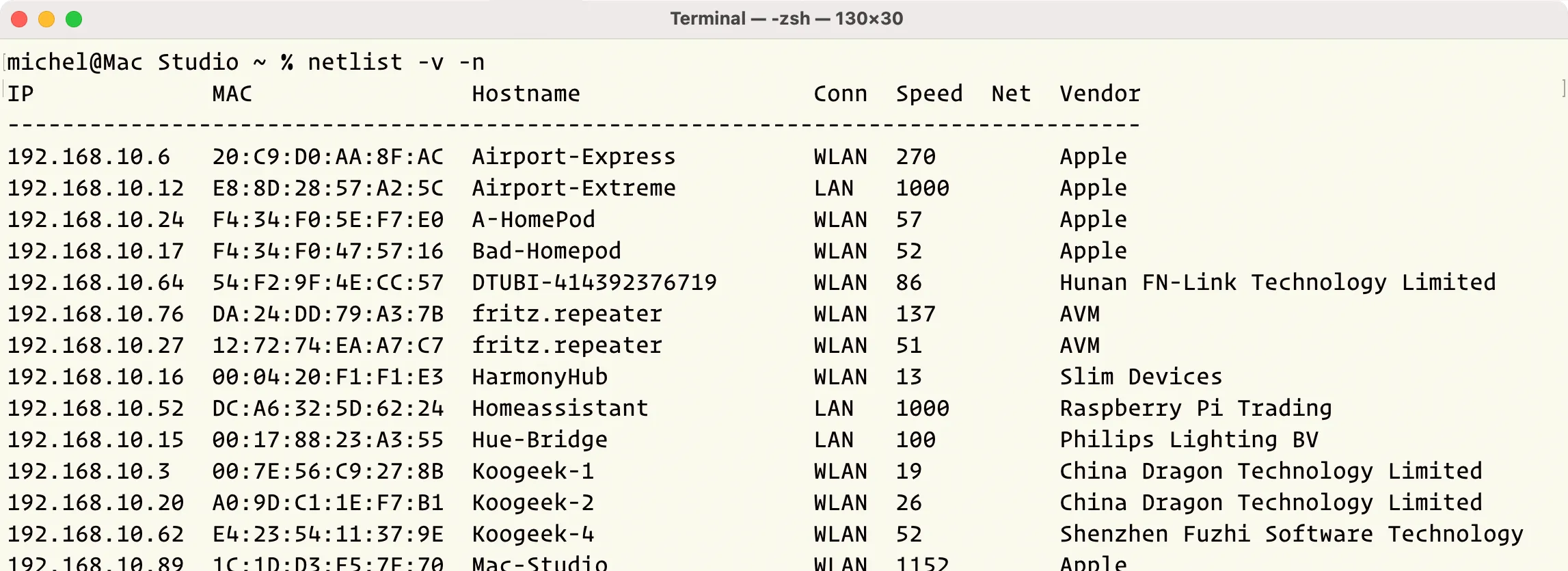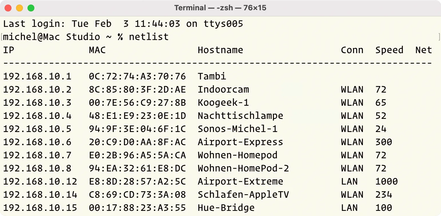 Das Ergebnis ist eine zsh-Funktion netlist, die in einer Sekunde eine saubere Übersicht sortiert nach IP-Adressen gibt. Die letzte Spalte (Net) zeigt an, ob sich das Gerät im Gastnetzwerk befindet: